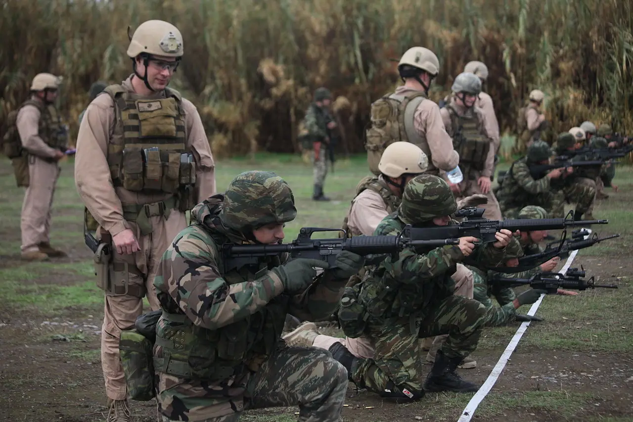 Soldados gregos e fuzileiros navais americanos em um posto de tiro. Foto do Departamento de Guerra dos EUA.